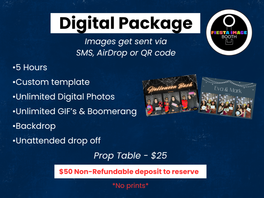 Fiesta Image Booth offers exciting digital package that make capturing memories at your event a breeze! With our user-friendly system, you can effortlessly receive your photos right on your mobile device. Share them instantly.